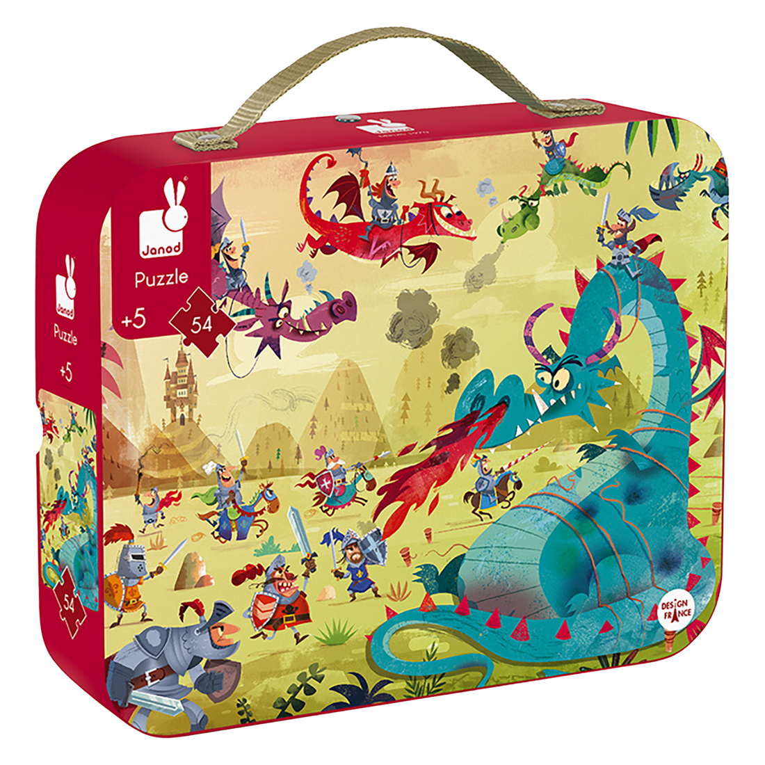 Aide les chevaliers à combattre les dragons! Dans sa jolie valisette, ce puzzle sera facile à transporter grâce à sa poignée en tissu. Contient un poster servant de modèle.