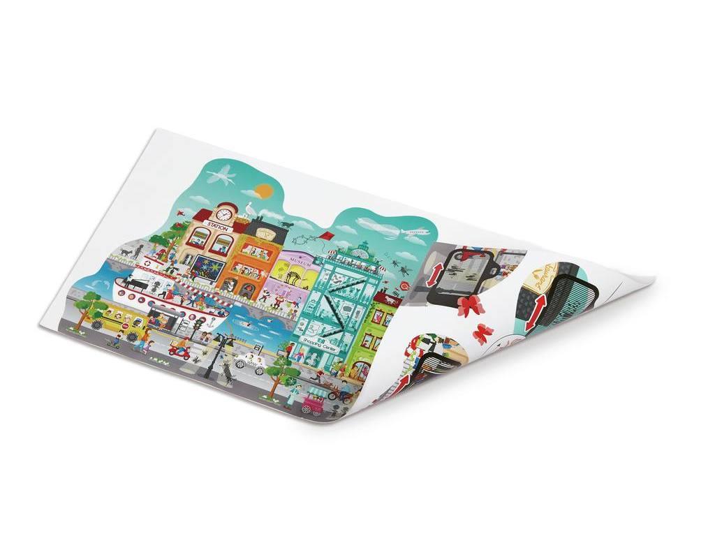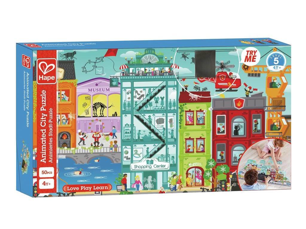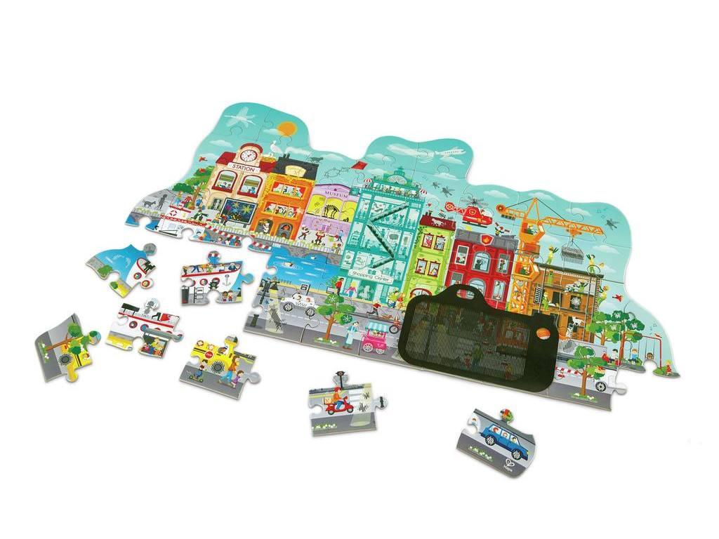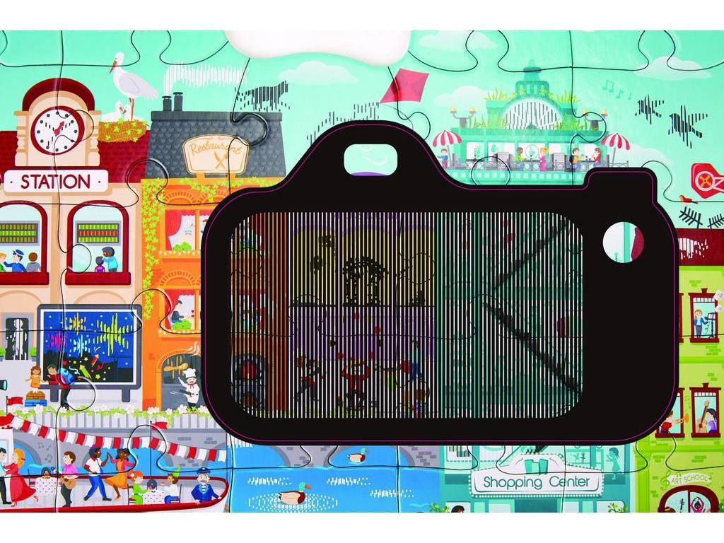 Un grand puzzle de 49 pièces représentant un paysage urbain avec une carte magique caméra qui crée des effets d’animation lorsqu’on la déplace sur l’image.