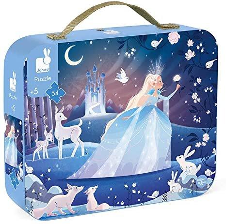 Plonge dans l'univers enneigé de la Reine des Glaces, tout en développant ta mémoire et dextérité, avec ce beau puzzle en carton de 54 pièces. Dans sa jolie valisette, ce puzzle sera facile à transporter grâce à sa poignée en tissu. Contient un poster servant de modèle pour les débutants, les plus aguerris pourront ensuite réaliser le puzzle en toute autonomie.