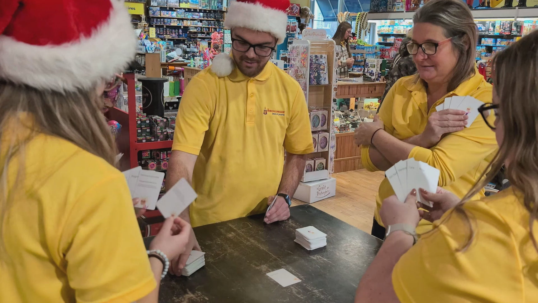 On distribue 4 à 5 cartes chacun, suivant le nombre de joueurs. Les cartes restantes forment une pioche.