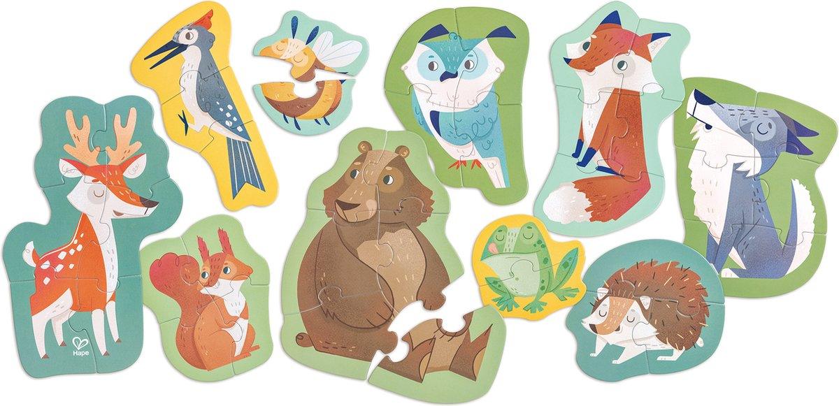 Coffret de 10 petits puzzles entre 2 et 6 pièces sur les animaux de la forêt. Il faudra reconstituer le loup, le renard, le hérisson, la grenouille, l'ours, l'écureuil, l'abeille, le pivert, le cerf et le hibou. Chaque puzzle est rangé dans une enveloppe avec un autocollant de l'animal correspondant. Idéal pour découvrir les animaux et les puzzles de façon progressive.