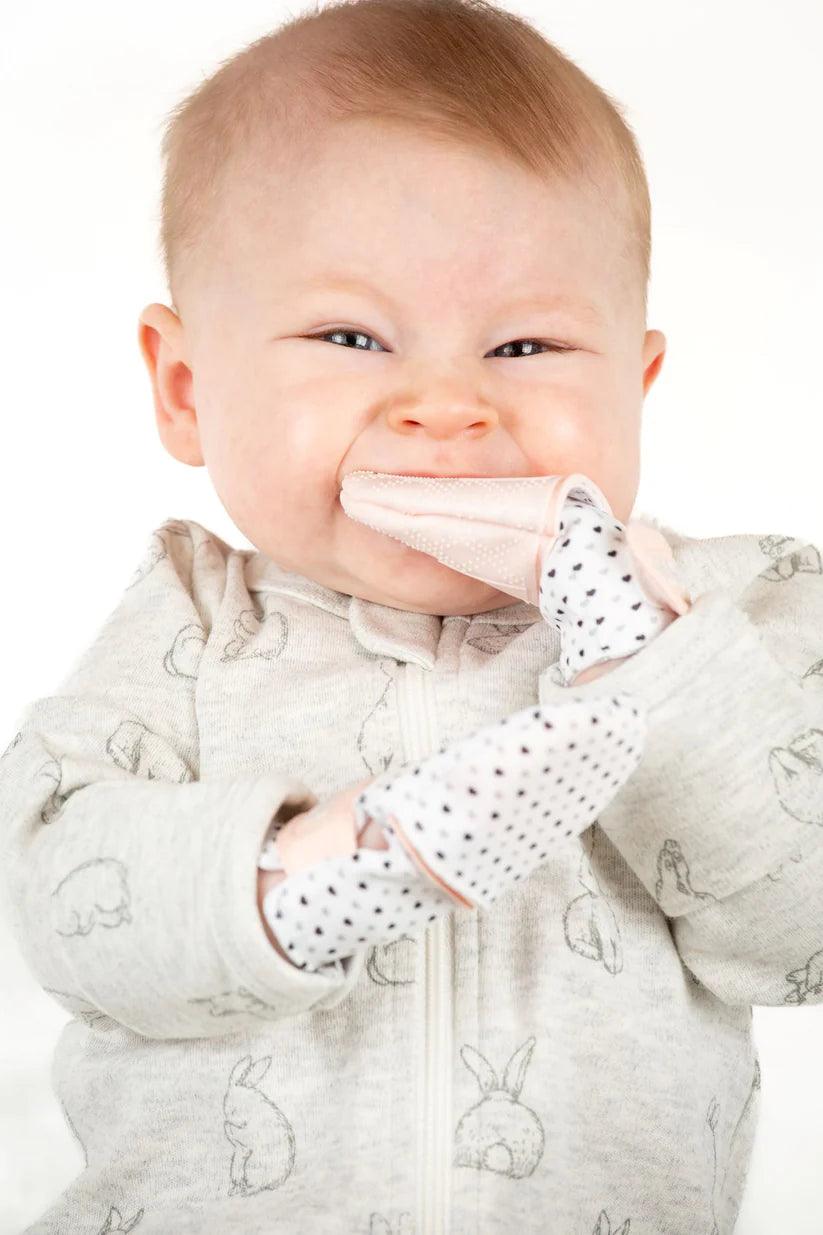 Nous avons combiné les traditionnelles moufles anti-griffures pour nouveau-nés avec la technologie de capuchon en silicone de marque Munch Mitt pour créer les moufles anti-griffures et à mâcher parfaites pour les nouveaux-nés. Un côté du capuchon à double face est doté de silicone doux et texturé pour que le bébé puisse sucer, tandis que l'autre côté est en tissu doux pour protéger contre les égratignures. Offrant deux utilisations en une seule paire de moufles, il vous suffit de choisir le côté requis et de l'attacher aux mains du bébé. Pour les bébés de 0 à 3 mois.