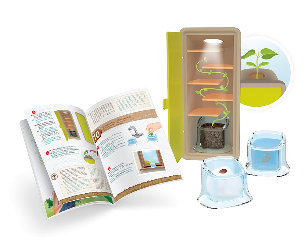 Contient : 3 petits pots transparents, une armoire à germination avec étagères ainsi qu’une notice illustrée en couleurs avec jeu de piste. Graines non incluses.