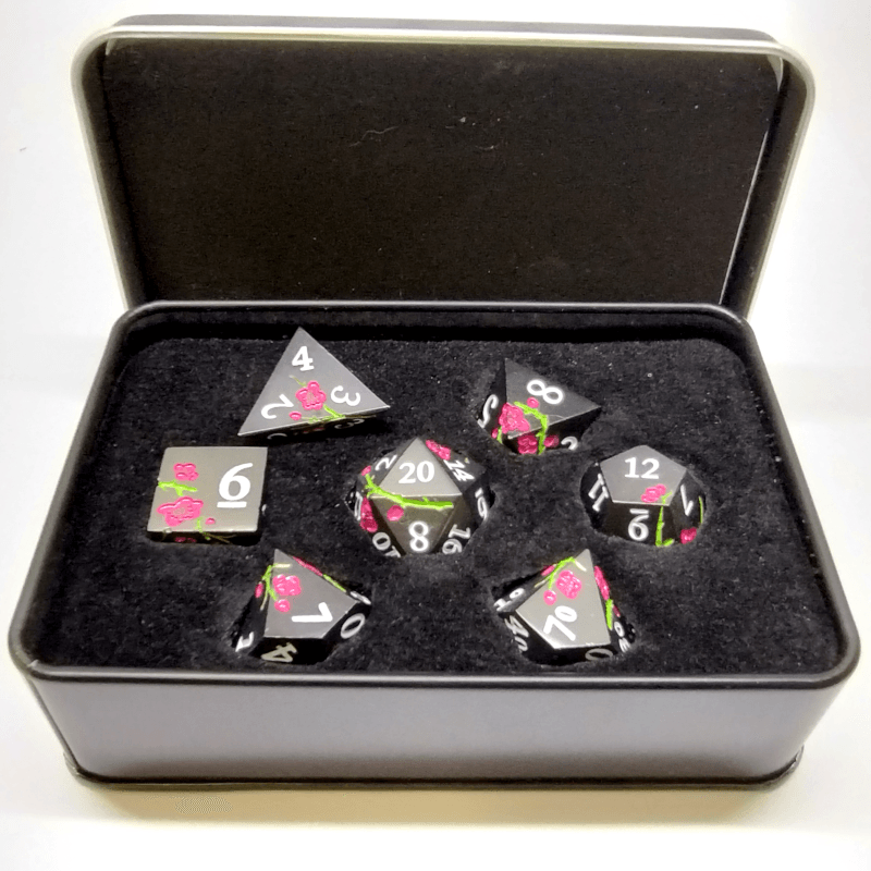 Dés fleurs de prunier en métal - noir avec fleurs roses est en rupture de stock et sera expédié dès qu’il sera de retour en stock.