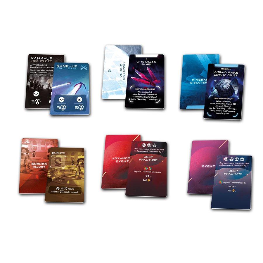 Then, you will prepare your crew for landing on the next planet, in search of answers to humanity's biggest questions. Together you will pick lander and customize it with modules, then each section will choose a crew member to take on a mission ( more experienced crew members will have better ranks ), deck-build skills deck, take equipment and choose dices for his character.