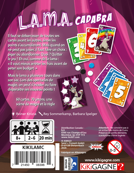 Dans L.A.M.A. cadabra, il faut se débarrasser de toutes ses cartes avant les autres, sinon les points s’accumuleront. Mais quand on ne peut pas jouer, il faut faire un choix : piger ou abandonner. Quoi ? Quitter le jeu ! Eh oui, comme dit le lama : « Il vaut mieux arrêter les frais avant de péter son budget. »