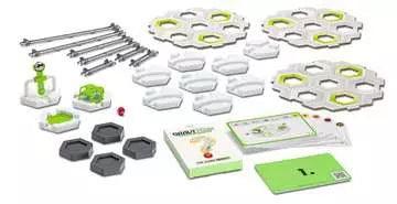 1 guide de jeu, 30 cartes-défis, 6 fiches tutoriels, 3 plaques en carton hexagonales, 1 bloc de départ, 1 bille, 1 bloc d'action Marteau, 4 blocs de construction épais, 7 virages, 1 croisement, 2 rails longs, 2 rails moyens, 3 rails courts, 1 bloc d'arrivée