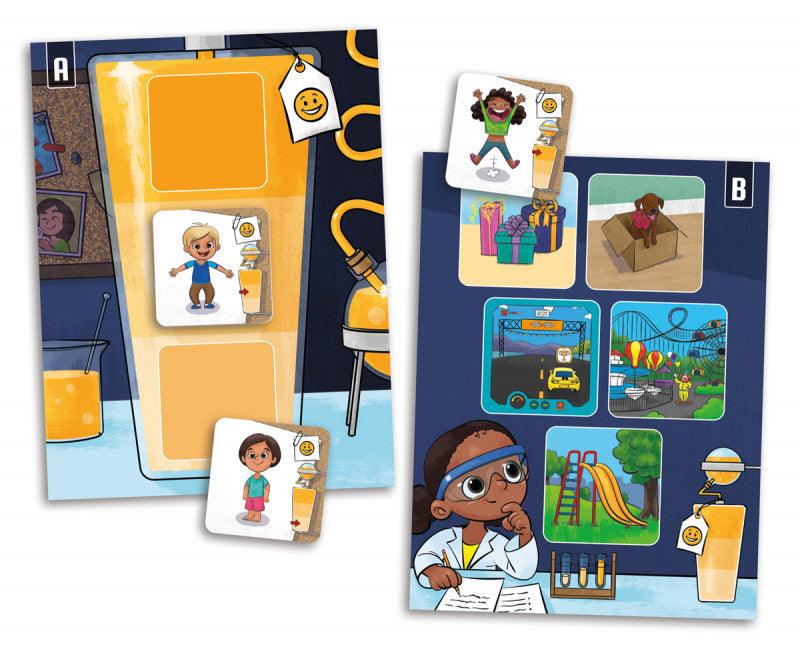 Le laboratoire des émotions est conçu pour aider les enfants de 4 ans à 7½ ans à reconnaitre des émotions exprimées à différents degrés d’intensité. Le jeu les amène progressivement à distinguer les émotions et leurs nuances en portant attention aux expressions faciales et aux gestes des personnages. Les différentes façons de jouer en font un jeu évolutif qui permet aussi aux enfants de réfléchir au lien entre une réaction émotionnelle et sa cause ainsi qu’au contrôle des émotions dans différentes situations.