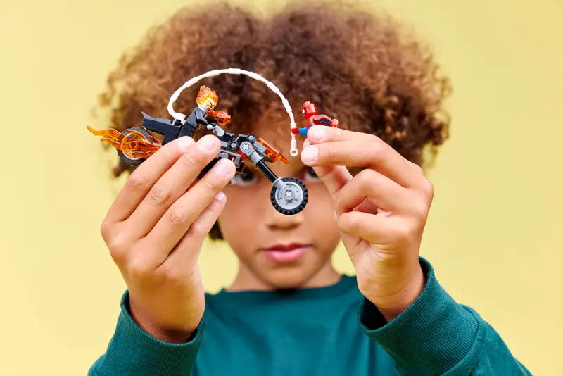 Lancez l’action de poursuite à grande vitesse des superhéros avec le jouet de construction Spider-Man contre la moto de Ghost Rider (76335) pour les garçons et les filles âgés de 6 ans et plus. La moto prête pour le combat et les 2 figurines dynamiques de Spider-Man et Ghost Rider de l’ensemble de construction LEGO® ǀ Marvel alimentent le jeu imaginatif des enfants. La figurine de Ghost Rider est représentée par un squelette avec des flammes qui s’échappent de ses mains et de sa tête. Sa moto emblématique comprend 2 pots d’échappement enflammés et 2 lance-tenons intégrés. Le fil de toile de la figurine de Spider-Man se fixe à la moto, offrant des possibilités de jeu de rôle infinies alors que les personnages s’affrontent sur et hors du véhicule à indice d’octane élevé.