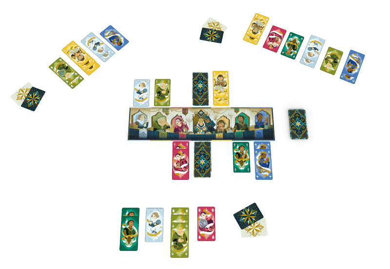À votre tour vous jouez 3 cartes Courtisans, chacune représentant une des familles de la cour royale. Deux de ces cartes sont placées chez vous et chez un adversaire afin de constituer des collections. La dernière est jouée à la table de reine afin d'influencer chaque famille : placez une carte au-dessus ou au-dessous du plateau pour donner une valeur positive ou négative à la famille correspondante. Les retournements de situations sont légions car certains Courtisans ont des rôles spécifiques. Des espions pourraient se glisser dans votre jeu et rendre l'issue incertaine. À moins que des assassins viennent vous retirer les cartes vous rapportant le plus. Pour obtenir le plus de points et l'emporter, vous devrez collectionner les bonnes familles tout en préservant leur valeur à la table de la reine.