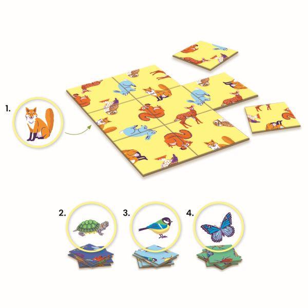 4 puzzles-défis qui rendent dingos ! À la façon d’un jeu de domino, reconstituez les images pour réussir chacun des 4 puzzles-défis et former un puzzle carré.