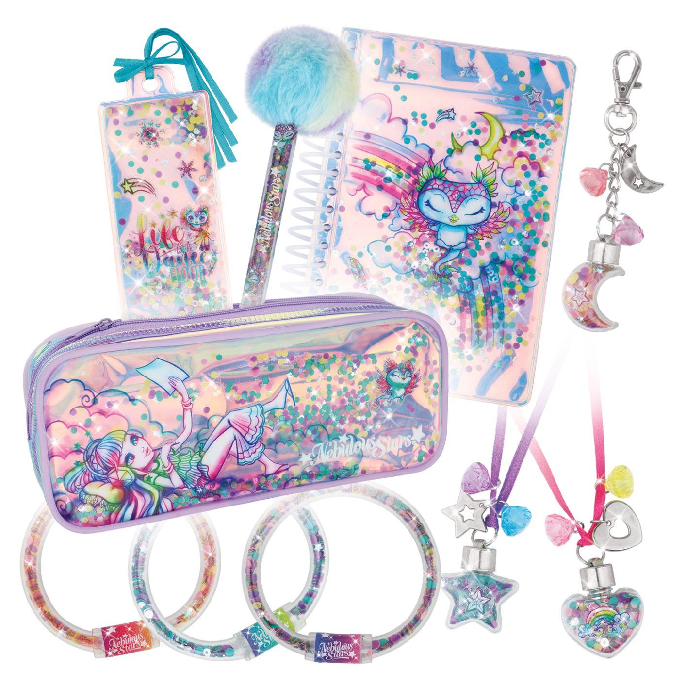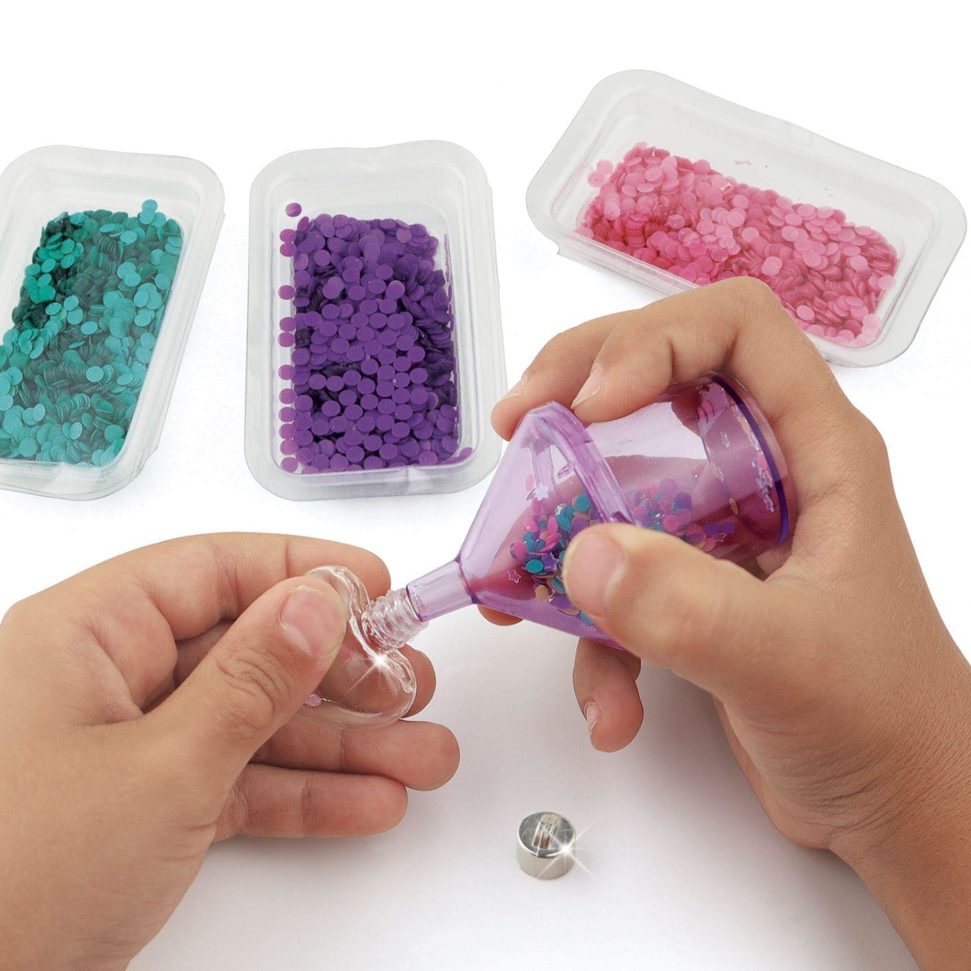 Paillettes en folie! Fabrique plusieurs accessoires, tous plus brillants les uns que les autres! Remplis de paillettes un carnet de notes, une trousse à crayons, un stylo, des bracelets et plus encore.