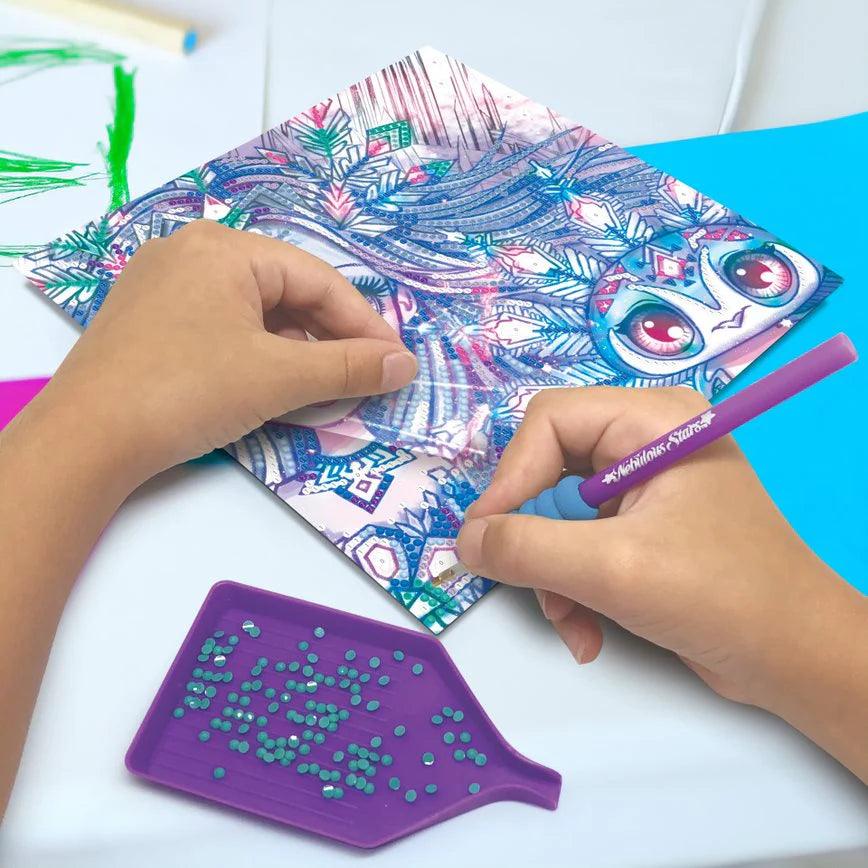 Colle des micro-strass avec l’applicateur spécial sur des modèles pré-encollés. Suis les nombres associés à chaque couleur. Le résultat final est étonnant!
