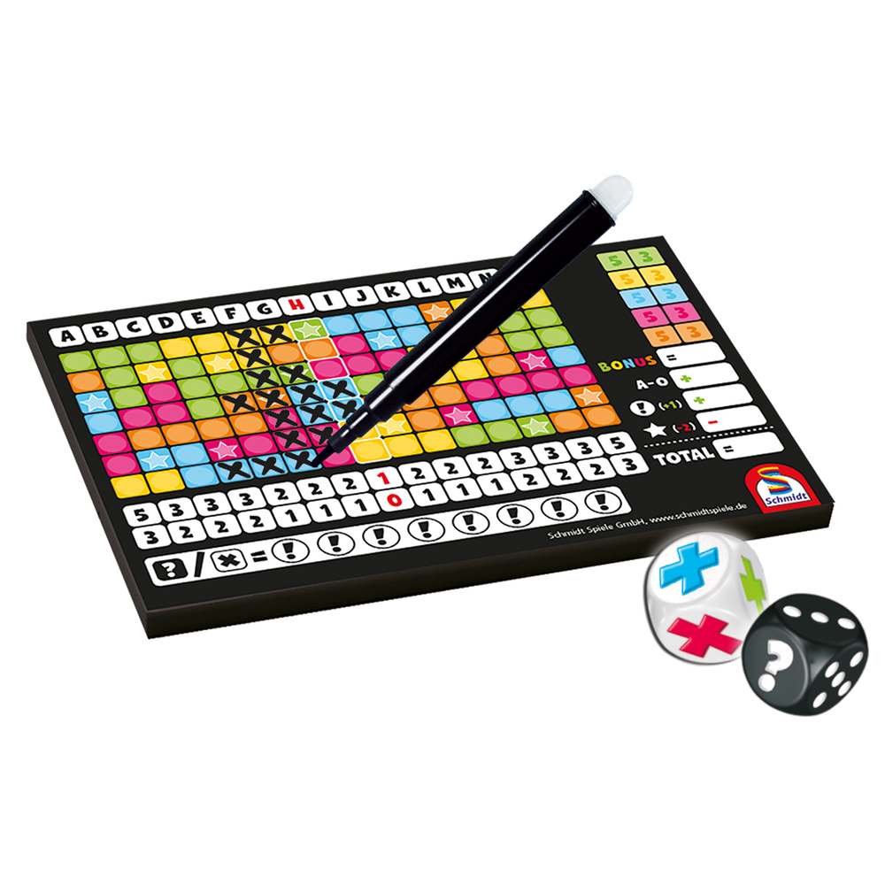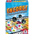 Un joueur lance les 6 dés, en prend deux et coche le résultat. Les autres joueurs choisissent 2 des 4 dés restants et cochent des cases sur leur feuille de jeu. Seules les colonnes complètes apportent des points. Il s’agit donc de bien peser le pour et le contre et de faire les bons choix. ENCORE! est un jeu génial … on y rejoue encore et encore. On ne fait jamais qu’une seule partie !