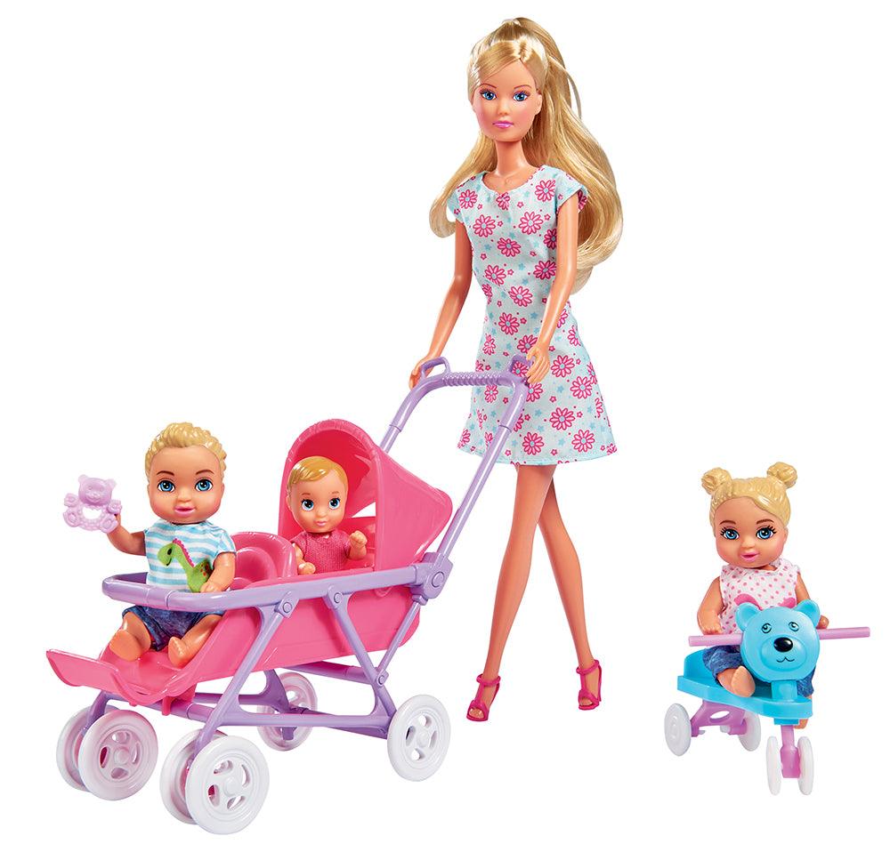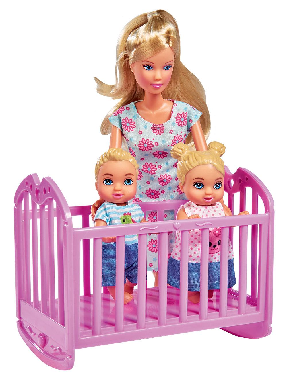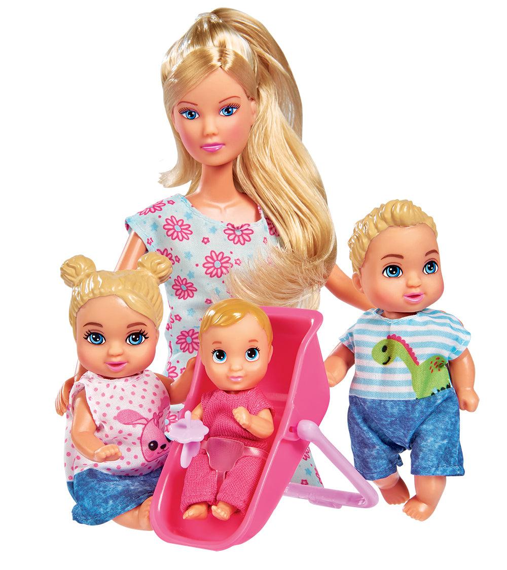 - Comprend 20 pièces : 1 poupée Steffi (29 cm), 3 bébés (7 cm), 1 couchette, 1 poussette, 1 chaise haute, des accessoires et plus encore