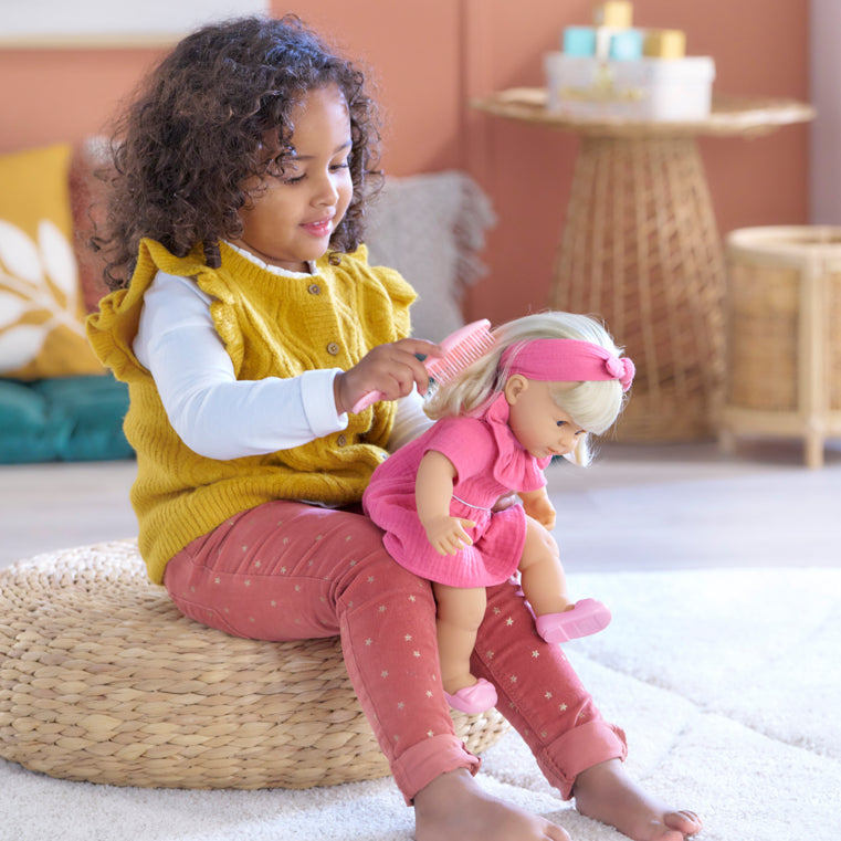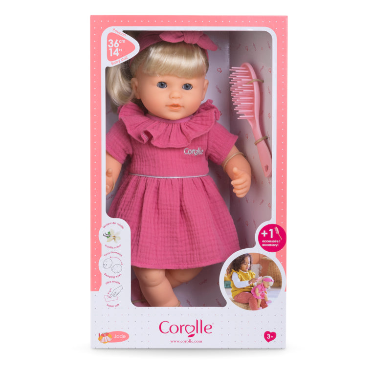 Avec les long cheveux blonds faciles à coiffer et sa brosse rose incluse, le grand poupon Jade est le compagnon idéal pour que votre enfant réalise ses toutes premières coiffures! Du haut de ses 36 cm (14''), Jade a la taille parfaitement adaptée aux petits bras de votre enfant pour câliner, materner et reproduire les gestes qui font devenir grand. Son corps est souple, elle peut donc tenir assise et être manipulée facilement par votre petit. Jade est fatiguée par les séances de coiffure? Allongé sur le dos, elle ferme les yeux pour faire un gros dodo bien mérité. Ce grand poupon a la peau blanche et yeux bleus a tous les attributs d'un poupon Corolle: son visage, ses bras et ses jambes sont en vinyle doux au toucher et ont cette délicate senteur de vanille. Elle est habillée d’une robe rose fuchsia en gaze de coton. Elle est coiffée d'un bandeau rose assorti à sa tenue, et chaussée d'une paire de ballerines roses.