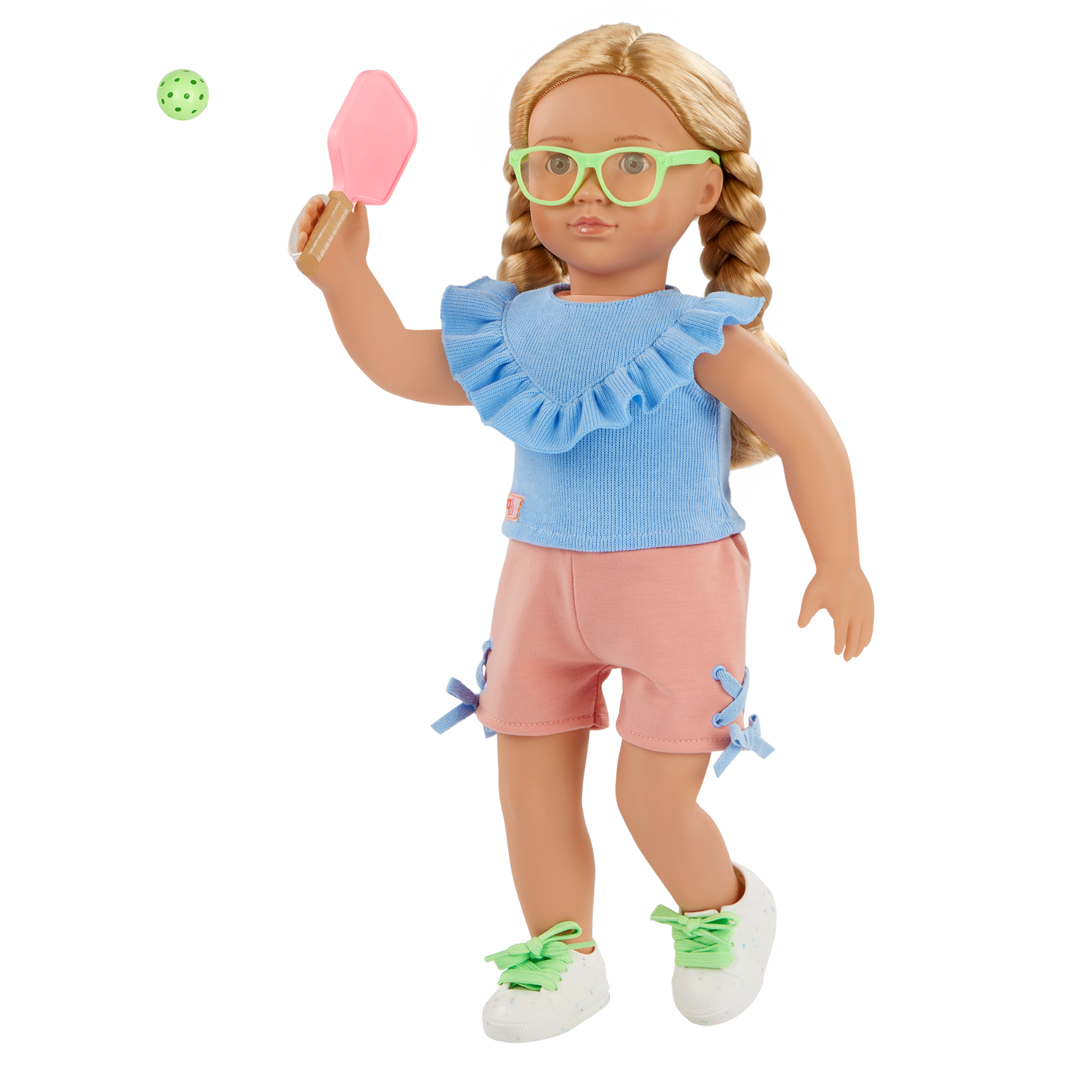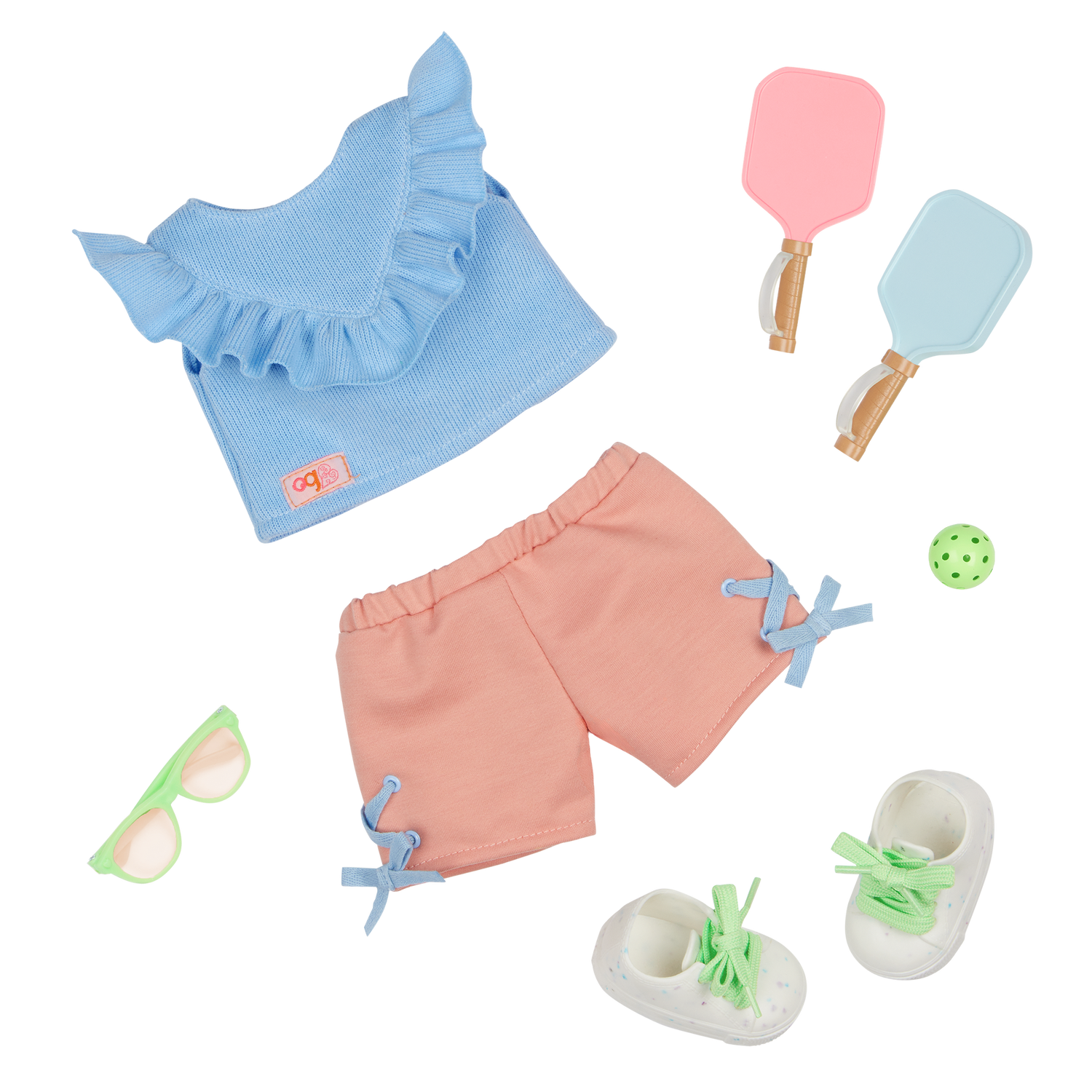 Que ce soit le jour du match ou n'importe quel jour, la tenue de pickleball Serve with Love pour les poupées de 18 pouces inspire de toutes nouvelles histoires et de nouveaux styles pour les fans de sport et les amoureux de la mode. Les joueuses de pickleball peuvent entrer sur le terrain avec une balle et deux accessoires de pagaie. De plus, chaque pagaie est conçue avec des poignées que les poupées peuvent facilement tenir pour encourager un jeu de rôle actif! Avec des couleurs gaies comme le rose tendre et le bleu vif avec une touche de vert fluo, les enfants peuvent mélanger et assortir avec d'autres vêtements de poupées Our Generation pour égayer la mode et lancer de nouvelles tendances - sur le terrain ou en dehors.