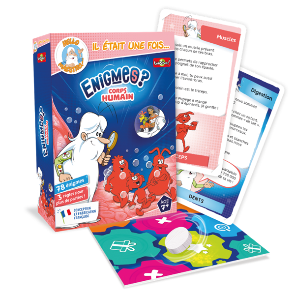 Aux côtés de Maestro, serez-vous le plus rapide à deviner les parties du corps humain qui se cachent derrière les 5 indices ? Attention ! Il vous faudra aussi faire preuve d’adresse en lançant le jeton sur le plateau pour gagner (ou non) plus de cartes…