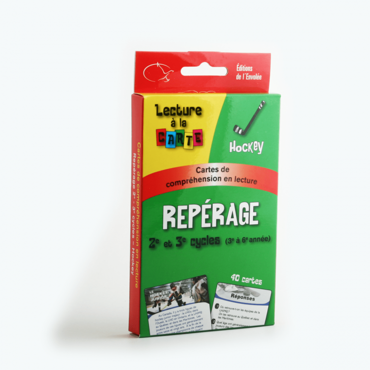 Lecture à la carte est une collection de jeux de cartes de compréhension en lecture conçus pour être joués oralement. Chaque jeu propose 40 courts textes suivis de questions de différents types. On s’adonne à ce jeu en groupe, en équipes et même en solitaire puisque les réponses sont écrites au verso des cartes. Les questions de ce titre travaillent principalement le repérage des informations dans le texte. Les textes permettent d’en apprendre davantage sur le hockey.