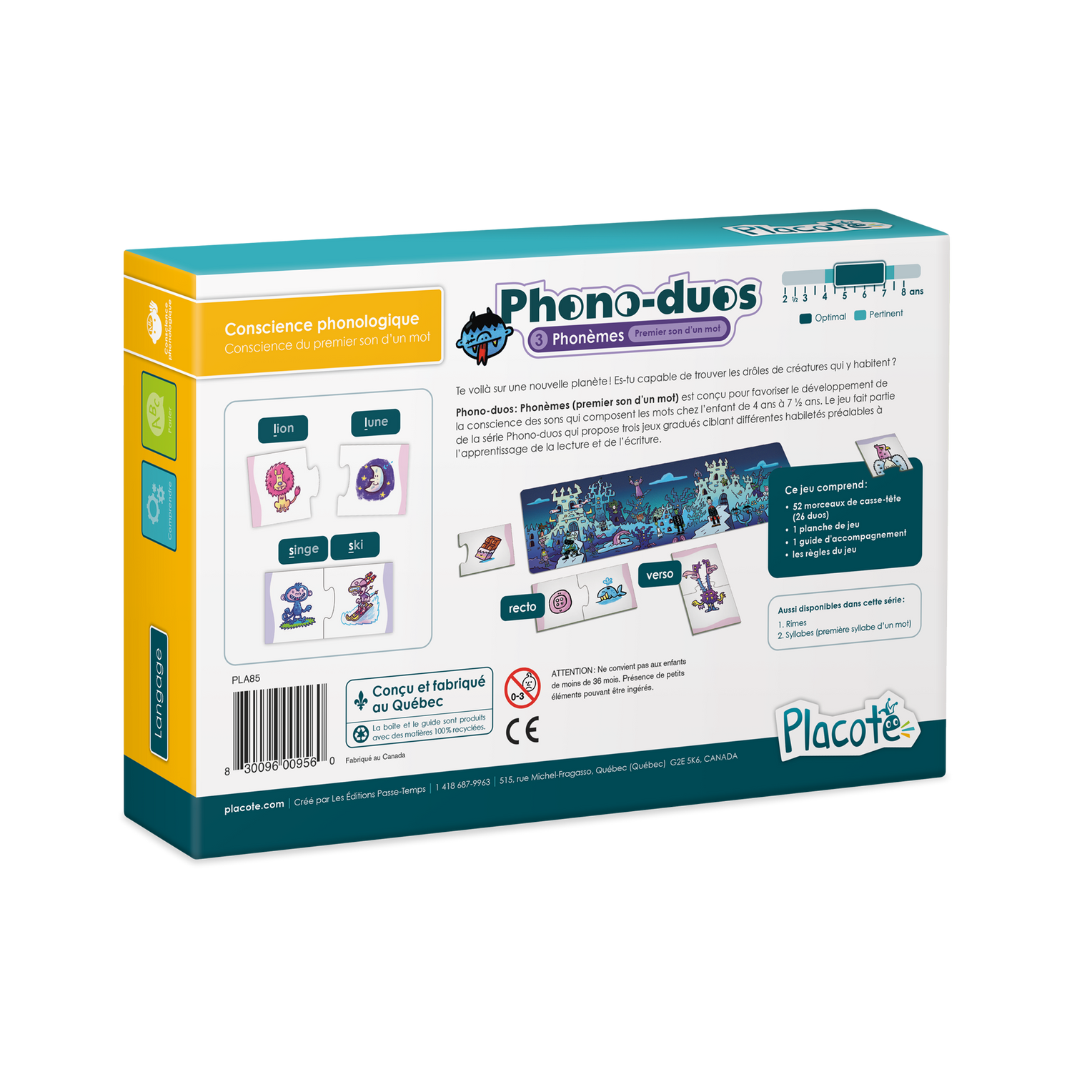 Phono-duos : Phonèmes (premier son d'un mot) est conçu pour favoriser le développement de la conscience des sons chez l'enfant de 4 ans à 7½ ans. Le jeu fait partie de la série Phono-duos qui propose trois jeux gradués ciblant différentes habiletés préalables à l'apprentissage de la lecture et de l'écriture.