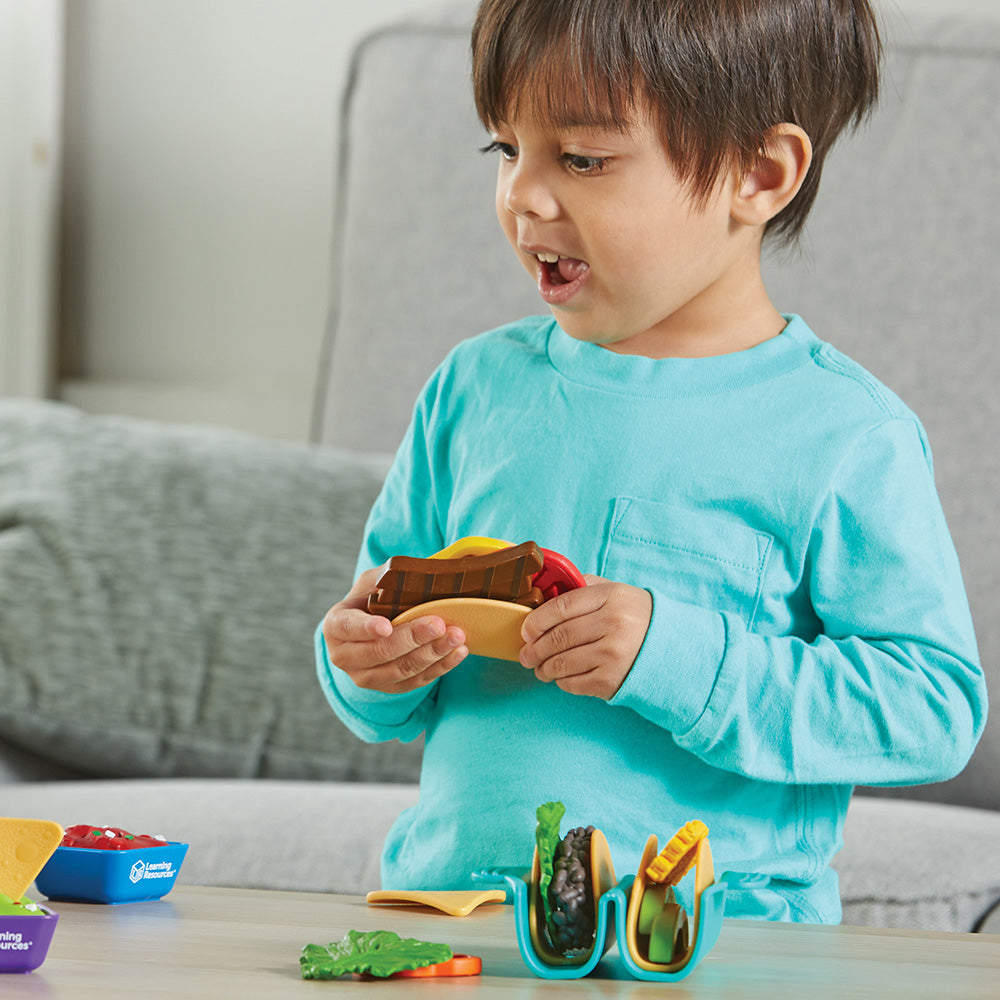 Ce kit de 28 pièces contient tout ce dont les enfants ont besoin pour faire semblant de se régaler : 2 tortillas dures, 2 tortillas molles, un porte-tortilla, un porte-taco, 2 pots de salsa, 1 pot de guacamole avec des chips amovibles et des garnitures assorties.