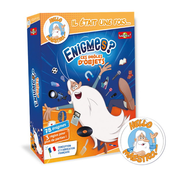 Aux côtés de Maestro, serez-vous le plus rapide à deviner les drôles d’objets qui se cachent derrière les 5 indices ? Attention ! Il vous faudra aussi faire preuve d’adresse en lançant le jeton sur le plateau pour gagner (ou non) plus de cartes…