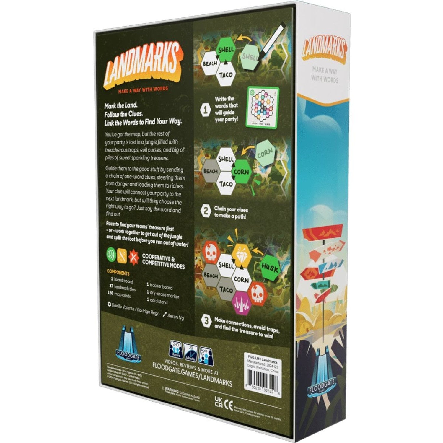 Landmarks est un jeu de lettres avec des chemins cachés et des indices astucieux. Votre groupe est perdu dans la jungle d'une île et compte sur vous pour le guider vers la sécurité et le trésor ! Dans cette jungle, chaque mot compte. Utilisez des jeux de mots stratégiques pour envoyer une chaîne d'indices d'un seul mot. Les liens entre eux créeront un chemin menant à la fortune et à la gloire.
