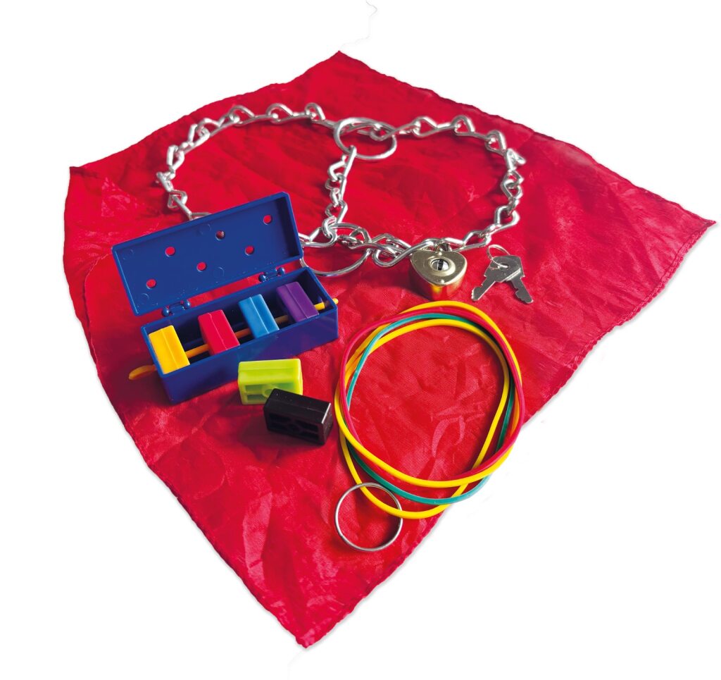 Inspiré par le grand Harry Houdini, je vais te révéler comment te libérer magiquement de chaînes fermées avec un cadenas et réaliser différentes illusions liées au thème de l’évasion.