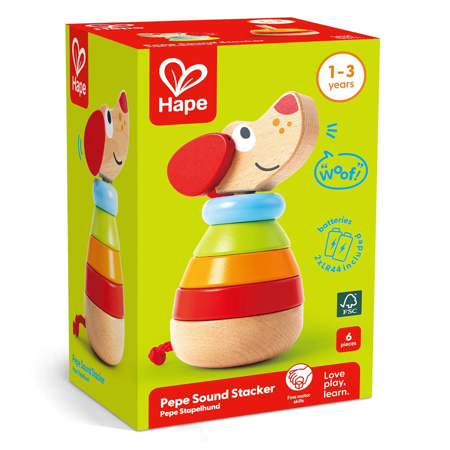 Ce chiot coloré à empiler de 6 pièces aide les enfants à identifier les différentes formes et les couleurs. Il aboie lorsqu'on lui cogne la tête.