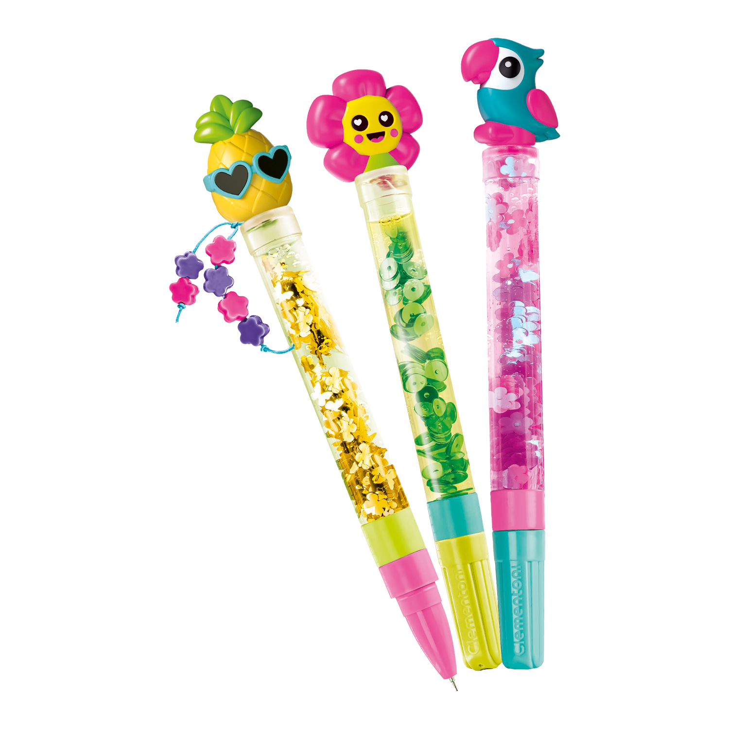 Un coffret créatif original qui permet d'assembler 3 stylos et de les personnaliser avec différentes décorations dans un style tropical.