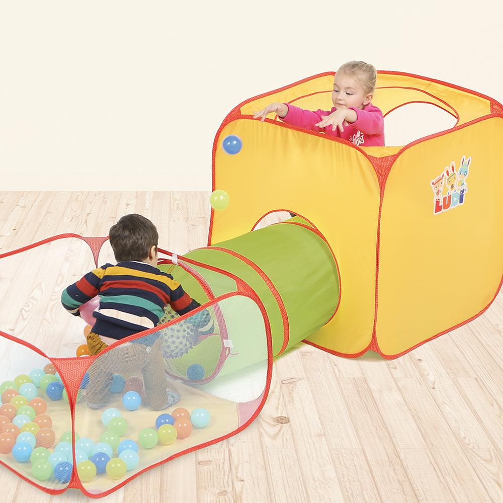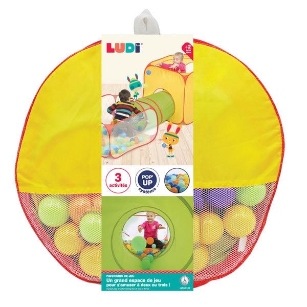 Découvrez un cube, un tunnel et une aire de jeu, le tout livré avec 30 balles! Ces trois espaces sont à utiliser seuls ou à combiner pour former un parcours pop-up unique. On joue comme on veut!