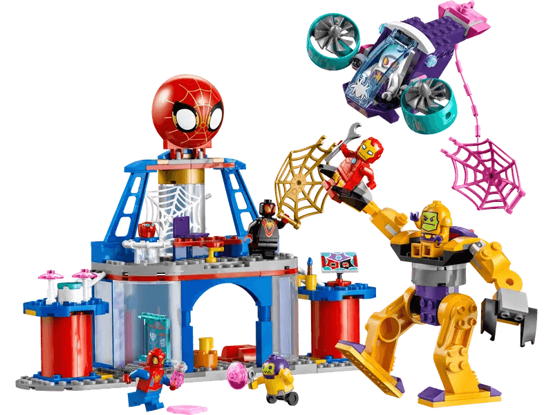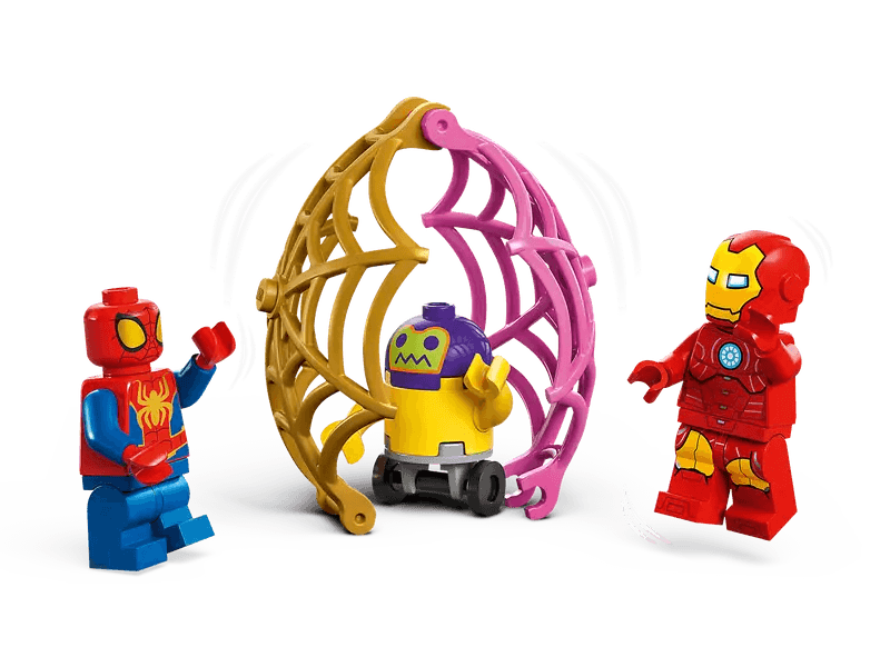 Cet ensemble de héros d’action LEGO Marvel comprend des figurines de Spidey, Iron Man, Miles « Spin » Morales, Ghost-Spider et Zola. Il y a un grand robot pour Zola avec des jambes et des griffes mobiles qui peuvent saisir une figurine, et un planeur avec des hélices rotatives, un habitacle qui s’ouvre et un grand élément de toile rose. Le contenu du bâtiment principal inspire le jeu de rôle des enfants en reflétant les intérêts des superhéros pour la science, la musique et la peinture.