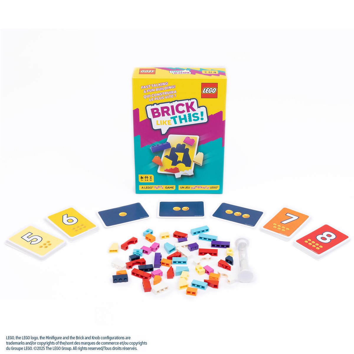 Brick Like This! Des équipes de deux personnes, un instructeur et un constructeur, sont chargées de construire une forme à partir de briques LEGO. L’instructeur lui expliquera comment créer une forme sur une carte de forme que seul l’instructeur peut voir. Toutes les équipes jouent en même temps, en s’efforçant de construire leurs formes le plus rapidement possible. Le vainqueur est l’équipe qui a marqué le plus de points à l’issue des six manches !