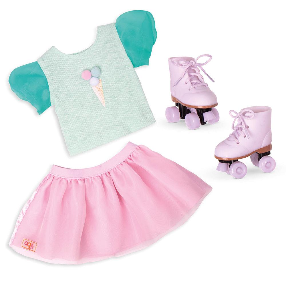 Habillez vos poupées avec ce haut coloré avec des manches à volants et une broderie décorative de crème glacée. Ajoutez ensuite la jupe à volants rose vif pour compléter le look. Les vêtements ont des fermetures faciles à ouvrir pour mettre ou retirer l'ensemble rapidement. N'oubliez pas les patins à roulettes rétro! Ils ajoutent une touche supplémentaire de plaisir à la garde-robe mode de votre poupée.