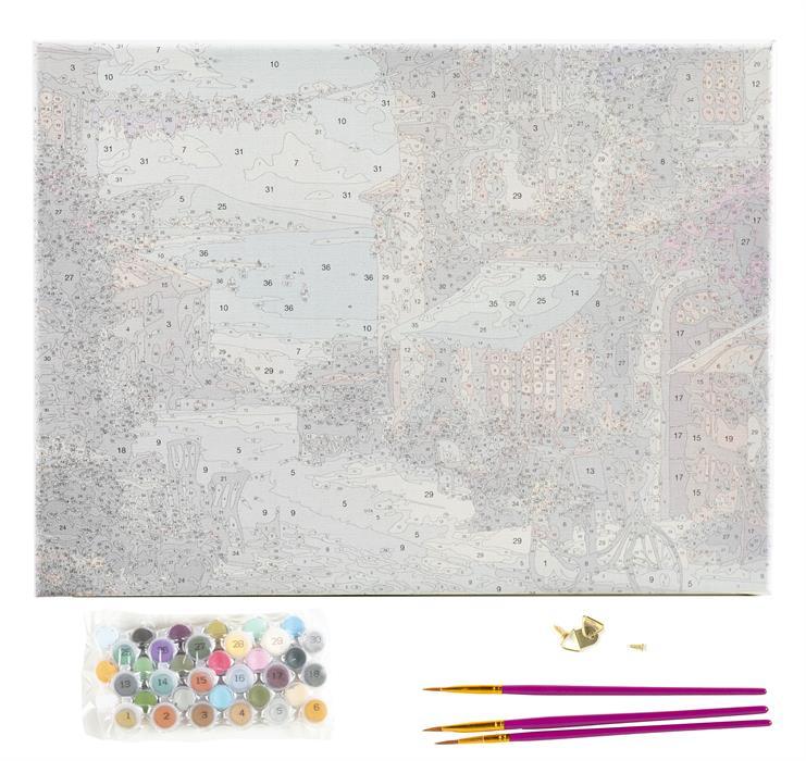 Ce kit Peinture par numéro motif "Italian Cafe" de Thomas Kinkade contient toutes les fournitures nécessaires :