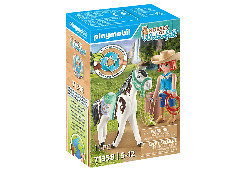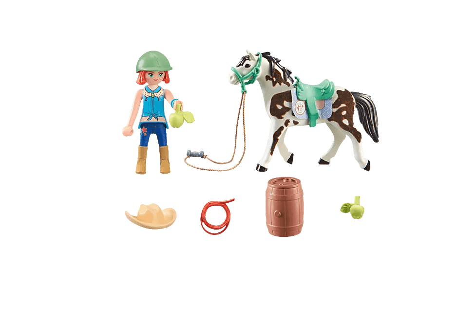 Tu aimerais découvrir l’équitation western ? Alors viens d’entrainer avec Ellie et sa jument Sawdust ! Ellie, une des cinq héroïnes de l’univers Horses of Waterfall, est passionnée par l’équitation Western et elle s’entraîne dès qu’elle le peut avec sa jument Tennessee Walker. Après l’entrainement, Sawdust a bien besoin d’être récompensée. Elle est toute douce et adore être caressée. Le coffret comprend Ellie, sa jument Sawdust qui a un pelage à effet velours, un lasso, un tonneau et des accessoires pour l’équitation western.