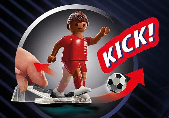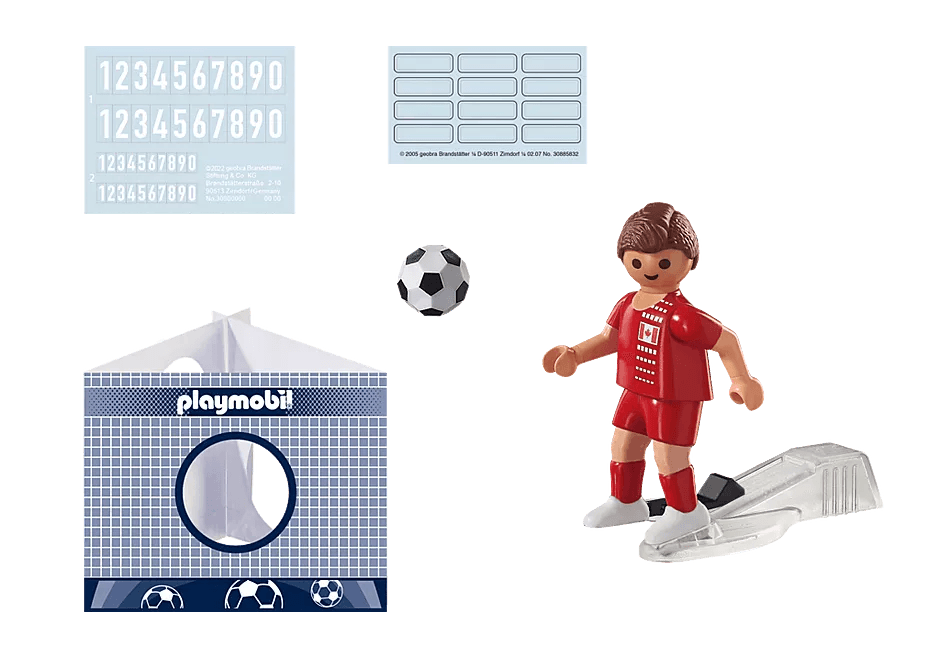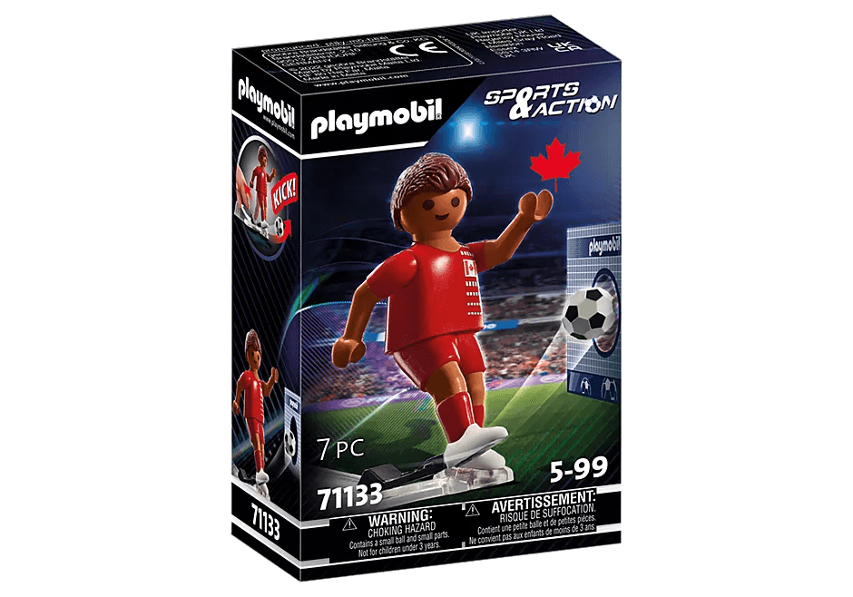 Joueur de soccer avec fonction de tir à une main. Maillot avec l'emblème de l'équipe du Canada. Comprend un ballon et une cage de foot pour s’entraîner aux tirs au but.