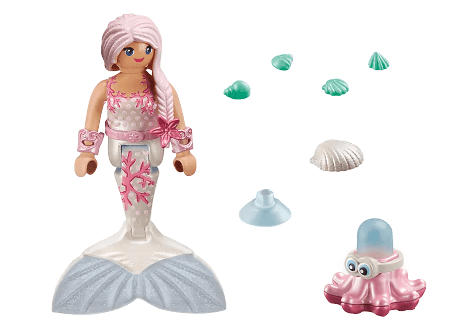 Bienvenue dans le monde coloré des sirènes ! Comprend un personnage, une pieuvre pulvérisatrice d'eau et des accessoires.