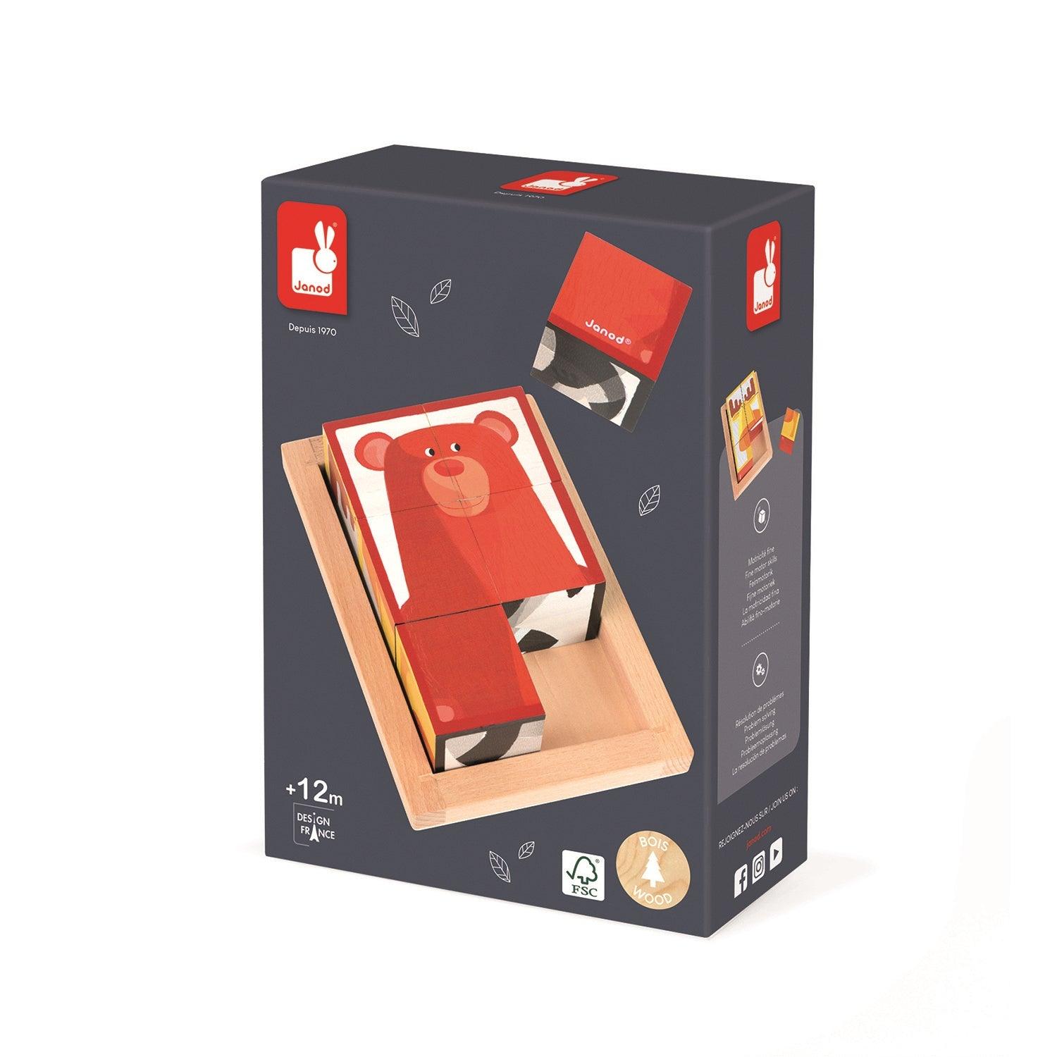 Jeu de 6 cubes en bois Zigolos sur le thème des portraits d'animaux de la forêt (renard, chouette, lapin, raton laveur, ours, élan). Il y a 6 illustrations à recomposer pour découvrir les 6 animaux de la forêt. Cette activité est idéale pour développer la coordination et le sens de l'observation.