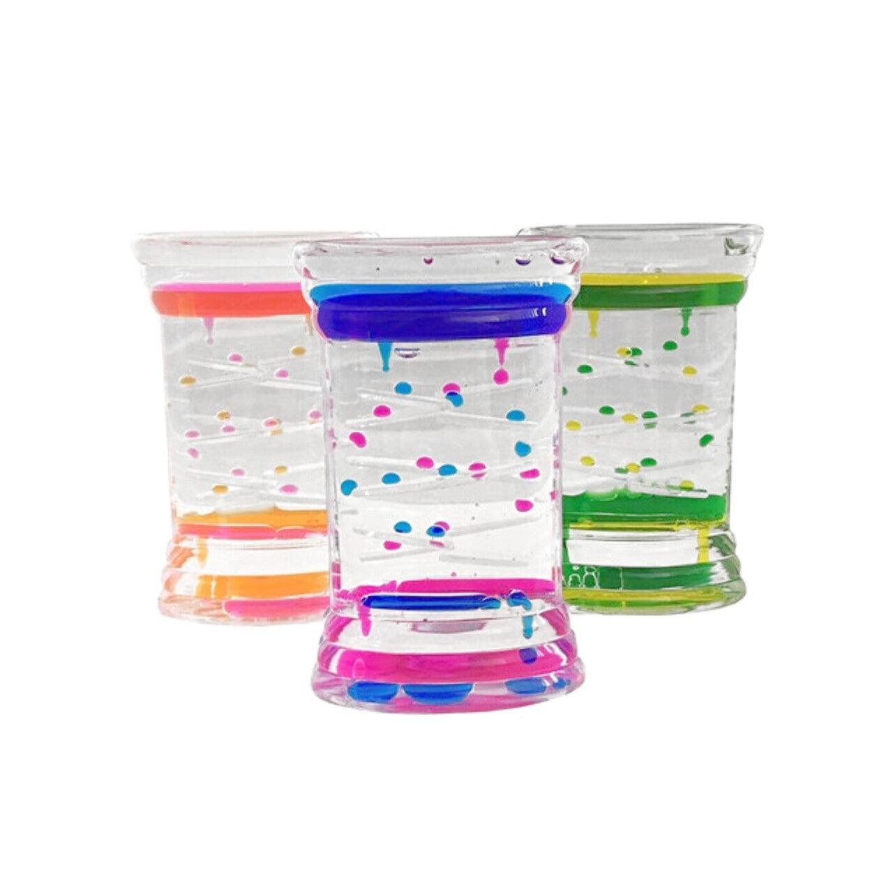 Cette minuterie de trois minutes présente un liquide bicolore descendant dans une formation en Z, créant un effet visuel cool.
