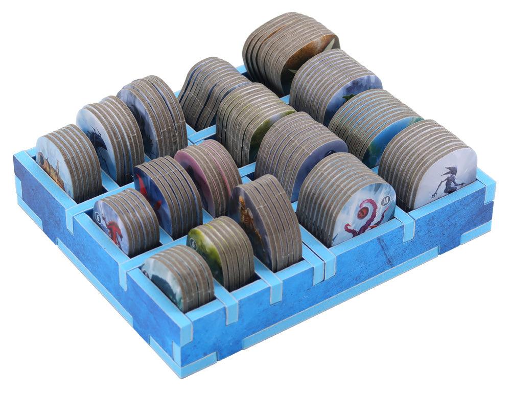 L'encart est livré avec quatre plateaux de joueurs optionnels, qui peuvent être utilisés si les tuiles de carte du jeu sont stockées ailleurs. Chaque plateau comporte des emplacements pour les cartes, des fentes pour les jetons et un creux dans le haut pour le plateau de jeu et la feuille.