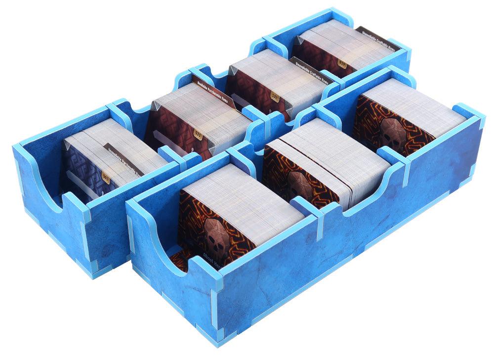 Le plateau situé au sommet de la boîte permet de ranger les monstres les plus grands, mais il peut également accueillir jusqu'à quatre boîtes miniatures. Si quatre boîtes sont ajoutées, il y a de la place pour une seule boîte du type plus grand. Les séparateurs de cartes livrés avec le jeu sont légèrement trop grands pour les mini plateaux de cartes à insérer de FS-FROST. C'est pourquoi nous avons fourni avec chaque exemplaire de la plaquette huit nouveaux intercalaires de cartes adaptés aux plateaux.