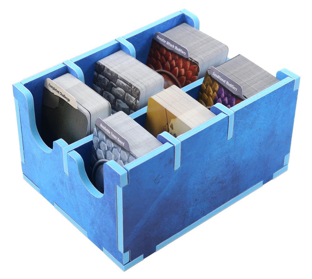 Encart officiel en couleur compatible avec Frosthaven®. La conception permet à la fois un rangement efficace et une amélioration du jeu. Les plateaux peuvent être utilisés pendant le jeu et facilitent grandement la mise en place et le rangement. Tous les plateaux de cartes ont un espace pour les cartes à pochettes.