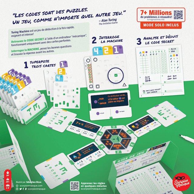 Turing Machine est un jeu de déduction compétitif unique en son genre. Retrouvez le code secret à l’aide d’un ordinateur « mécanique » fonctionnant avec uniquement des cartes perforées. Interrogez la machine, posez les bonnes questions et trouvez la réponse avant les autres.