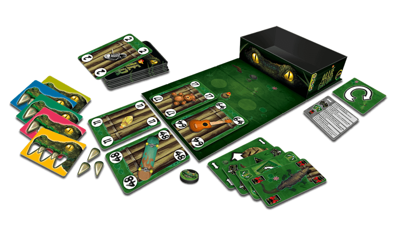 Attention ! Allie Gator a les crocs et vous guette ! Elle peut vous mordre à tout moment... Trouvez un moyen de la distraire : jouets, friandises, vieux jeu de société ou même un vieux pneu... Tout peut fonctionner, tant que vous lui mettez quelque chose sous la dent. Mais si vous n’avez rien à lui proposer... CROC ! C’est vous qui deviendrez son goûter ! Et gare aux points malus que vous subirez : vous risquez de vous en mordre les doigts ! Un jeu d'opposition simple mais traitre... À tour de rôle, vous allez jouer une carte de votre main (en fonction de sa valeur), avant d’en piocher une nouvelle. Si, à votre tour, vous ne pouvez poser aucune carte de votre main, vous devez prendre la ou les cartes déjà posées et les placer devant vous : elles s’ajoutent à vos points malus. Votre but est d’avoir le moins de points malus à la fin de chaque manche. Plus vous remportez de manches, plus vous avez de chances de remporter la partie !