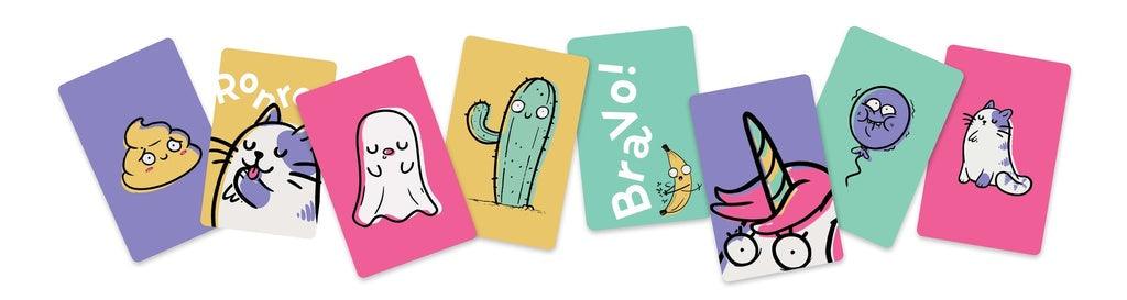 À chaque fois qu’une carte est tournée, tout le monde doit dire ou faire la même chose selon la.les cartes révélées. Délire et absurdité seront aux rendez-vous! Découvrez 10 personnages gribouillés et attachants de Bravo Bravo qui vont vous accompagner : la Boule Disco, le Petit Humain, la Slime, la Banane et plus encore! Attention aux cartes Confettis, elles vous demandent d’être créatif et de changer des règles au fil de la partie.