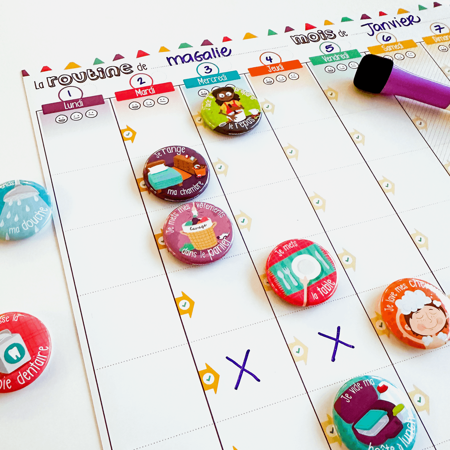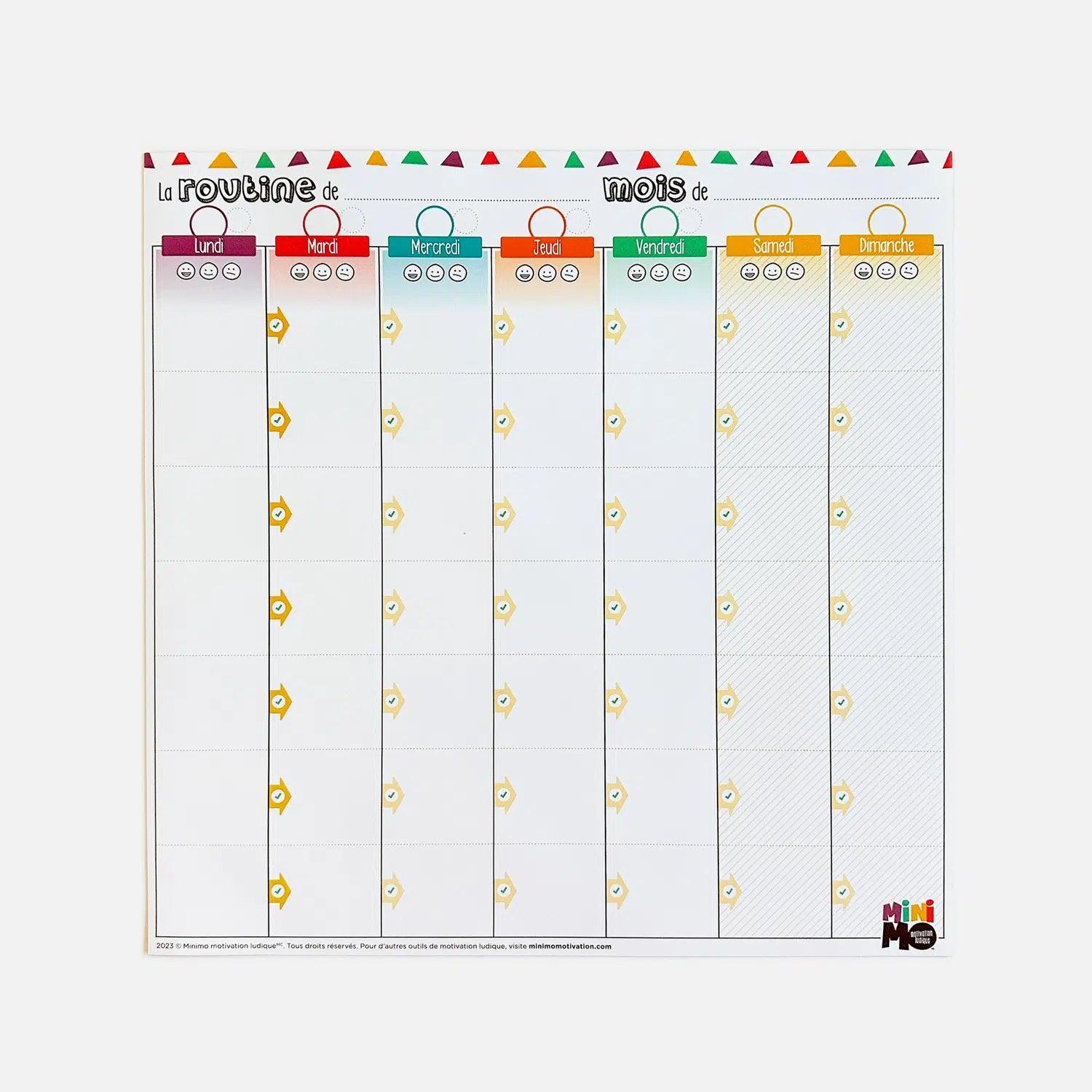 Le tableau de motivation Ma routine hebdo est un outil pratico-ludique qui permet aux minis (et aux préados !) de gérer la routine et de planifier la semaine de façon attrayante et motivante. À l’aide de tes aimants Minimo préférés, affiche les tâches de la journée et déplace-les au lendemain — ou plus loin — lorsqu’elles sont accomplies. L’outil parfait pour réduire l’anxiété et augmenter l’autonomie des petits et des grands !
