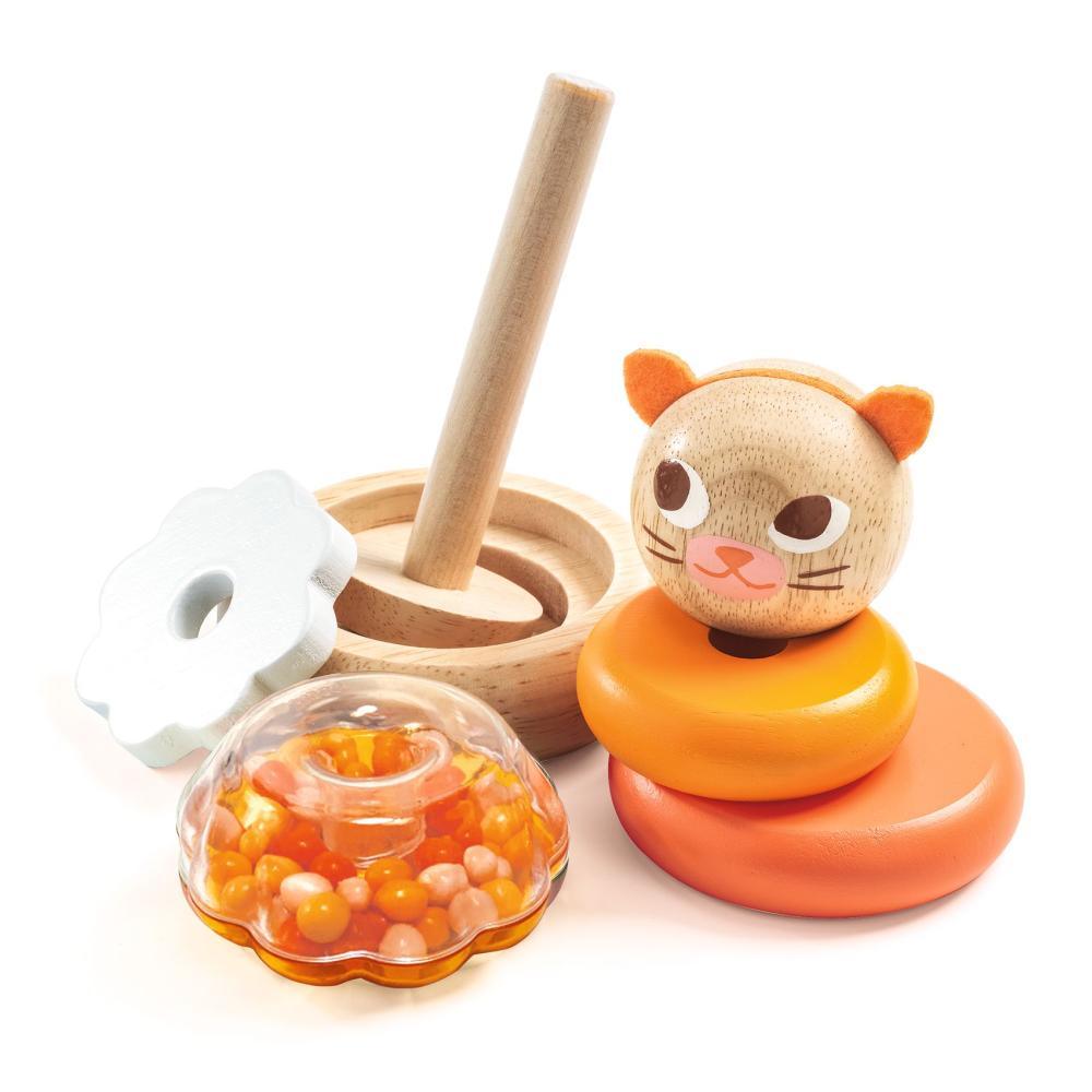 Un jeu d'empilement en bois, dans lequel un chat est mis en place avec les 4 anneaux. L'enfant empile les anneaux dans le bon ordre, du plus grand au plus petit, et place la tête du chat dessus pour compléter l'animal. Une surprise vous attend sous le plus grand anneau.