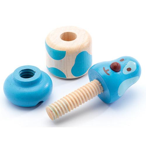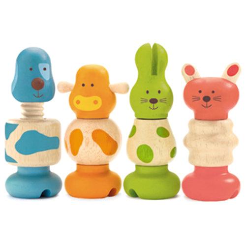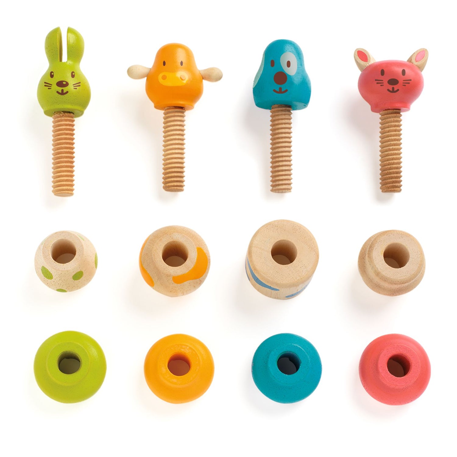Un jeu d’assemblage pour composer 4 animaux en bois (canard, vache, lapin et chat) ! L’enfant choisit une vis en forme de tête d’animal et cherche le corps et la base à visser de la même couleur. Il assemble les pièces en les vissant, puis joue avec les animaux.