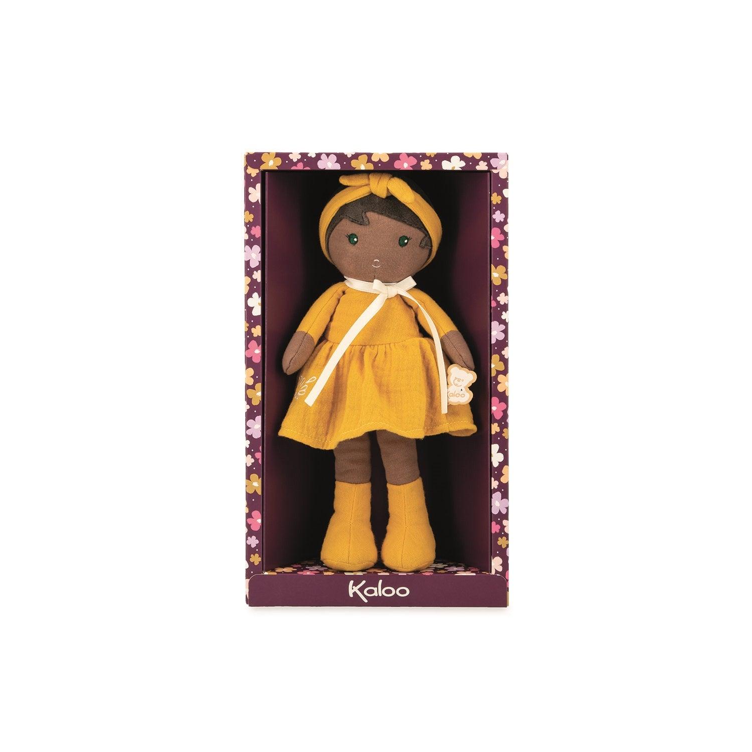 Naomie, la poupée en tissu aux tons colorés ! Dans son format 25 cm, cette délicate poupée en tissu Kaloo se caractérise par sa robe en mousseline de coton aux couleurs du soleil. Voilà une très jolie demoiselle, prête à suivre bébé dans toutes ses aventures, dès la naissance. Assortie à son foulard, sa belle robe jaune est brodée d'une marguerite, symbole de candeur et d'innocence. La poupée Naomie porte aussi de petites bottes, idéales pour gambader joyeusement dans les champs ! Elle arbore aussi un joli ruban, pour y inscrire le nom de son propriétaire et la rendre unique. De l'insouciance, de la joie et un amour de la nature : de doux présages transmis grâce à la première poupée de bébé. Toujours empreinte d'élégance et de douceur, cette poupée fait partie de la collection Tendresse. En micro-velours et mousseline de coton, elle est aussi composée de rembourrage à base de polyester recyclé. Toute la famille adore le look bohème et coloré de cette première poupée, elle est présentée dans un beau coffret : prête à offrir.